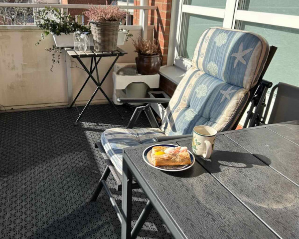 Det här är ett äkta vårtecken. Ut med stolarna och madrasserna för att ta våren första fika. Idag blev det räkbaguette från ICA-Söndrum. Deras räkbaguetter är de bästa i stan. Här är min del då jag delade baugetten med frun så klart.
